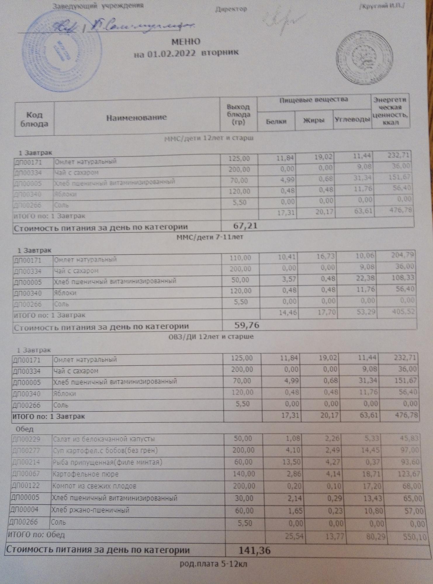 (Меню на 01.02.2022г)