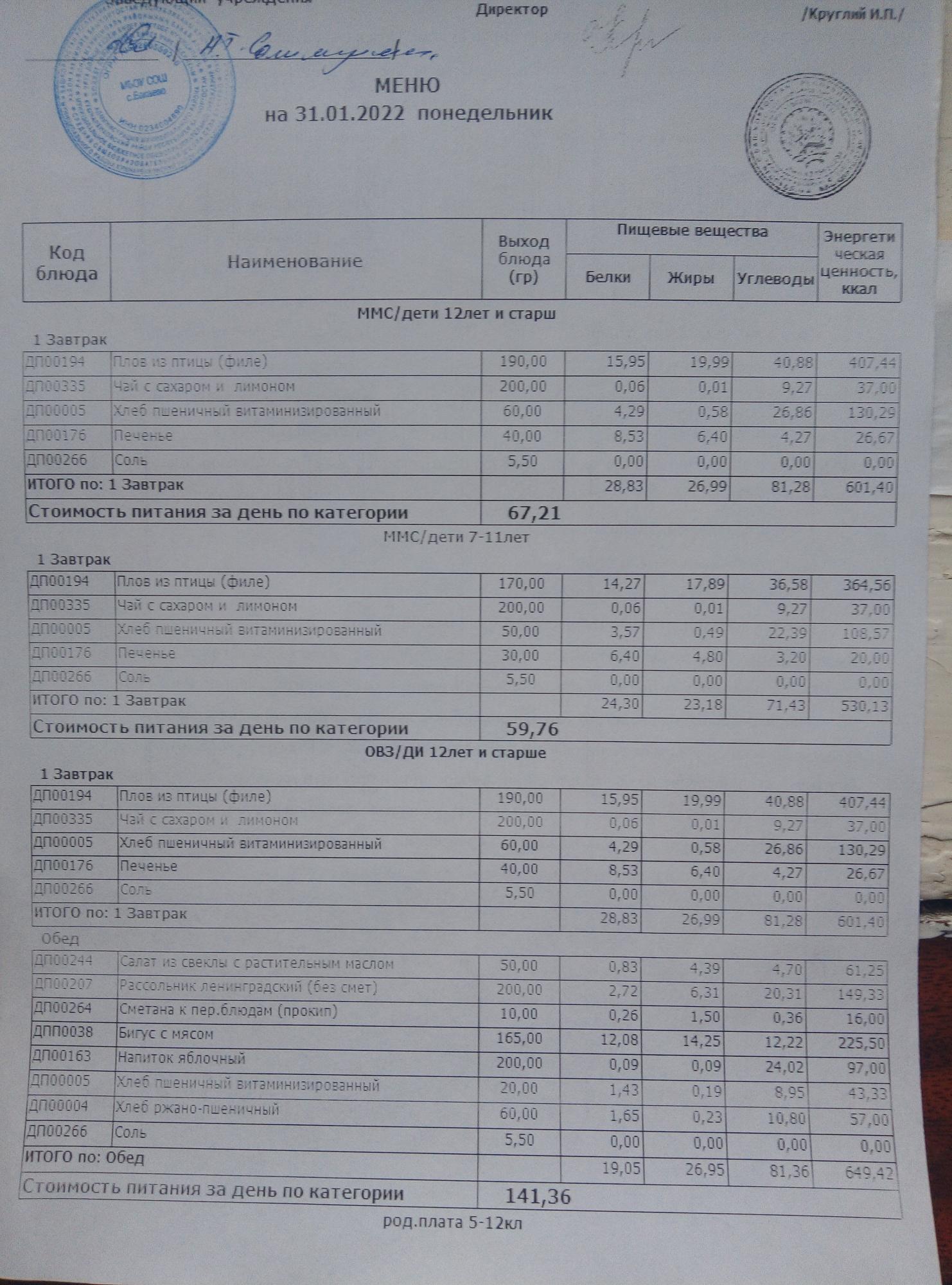 (Меню на 31.01.2022г)